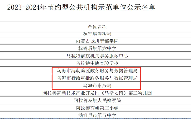 乌海市海勃湾区政务服务与数据管理局、乌海市行政审批政务服务与数据管理局、乌海市水务局、呼和浩特市乌海海关4家单位上榜2023-2024年节约型公共机构示范单位名单。
