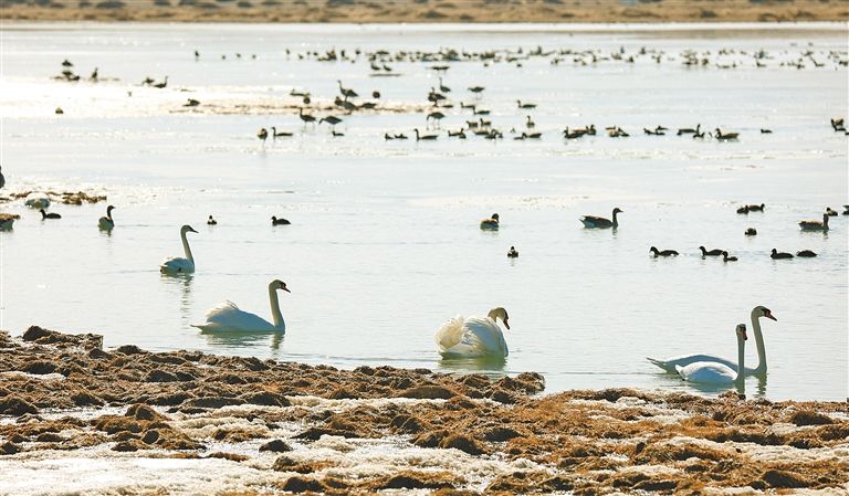 天鹅等候鸟接连来临,冬日的居延海热闹起来。