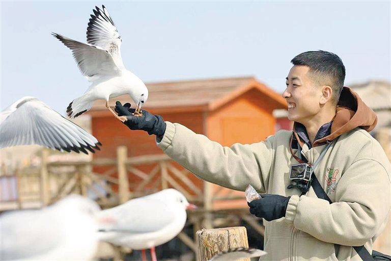 游客与水鸟互动。