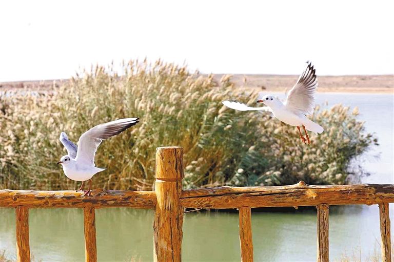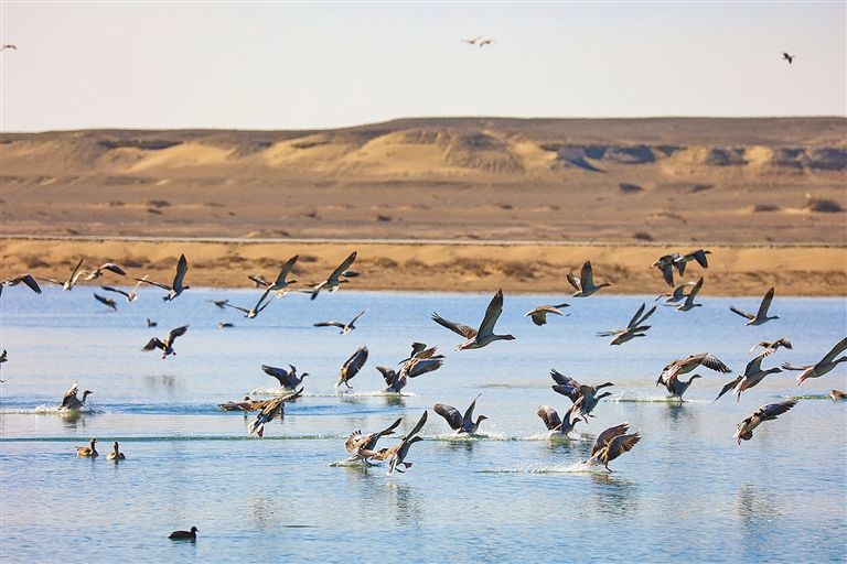 12月2日,阿拉善盟额济纳旗东居延海上候鸟翩跹。