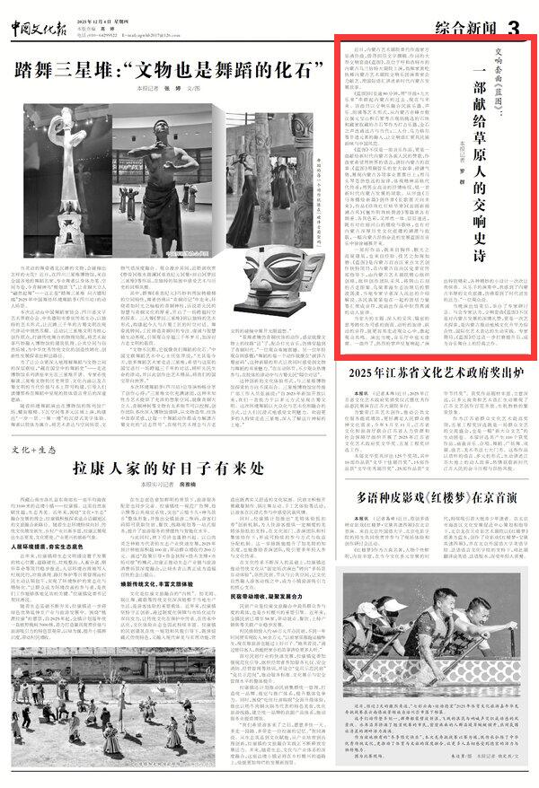 2025年12月4日《中国文化报》第3版刊发了《交响套曲《蓝图》:一部献给草原人的交响史诗》的文章,报道了近日,内蒙古艺术剧院委约作曲家方岽清作曲,曾伟担任文学撰稿、作词的大型交响套曲《蓝图》,在位于呼和浩特市的内蒙古乌兰恰特大剧院上演,指挥家黄屹执棒内蒙古艺术剧院交响乐团演奏家合力献艺,用国际语汇讲述新时代内蒙古发展故事。