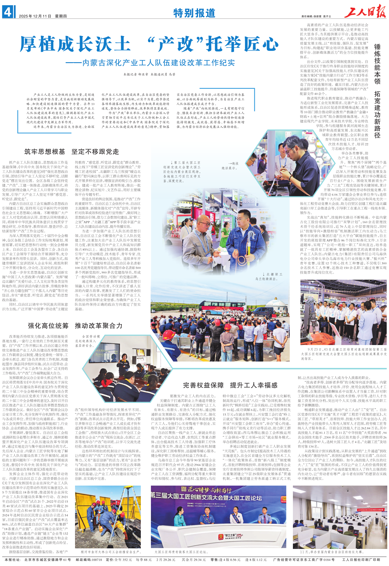 2025年12月11日《工人日报》第4版刊发了《厚植成长沃土 “产改”托举匠心——内蒙古深化产业工人队伍建设改革工作纪实》的文章,报道了近年来,内蒙古自治区大力推进、全面深化产业工人队伍建设改革,在自治区党委的坚强领导下,以改革为帆,以实干为桨,稳步推进各项举措落地生根,内生动力和改革效能持续迸发,整体合力持续释放,改革取得显著成效。