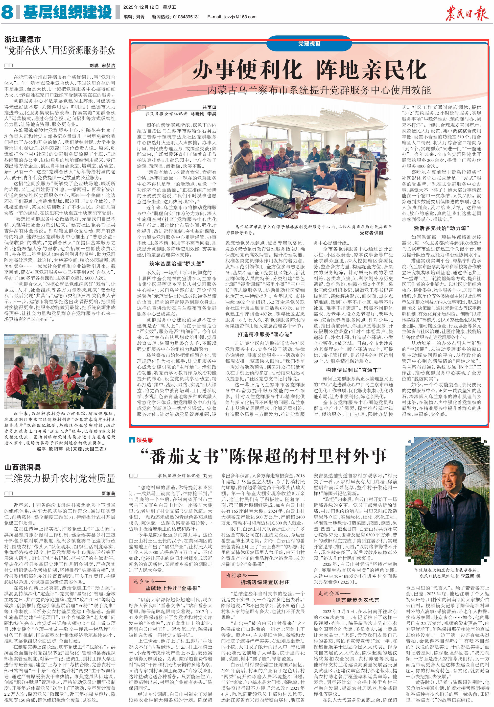 2025年12月12日《农民日报》第8版刊发了《办事便利化 阵地亲民化——内蒙古乌兰察布市系统提升党群服务中心使用效能》的文章,报道了近年来,乌兰察布市将推动党群服务中心“脱虚向实”作为努力方向,深入实施嘎查村(社区)党群服务中心优化提升行动,通过优化布局空间、强化功能提升、改进运行机制、夯实基础保障,全力解决党群服务中心重建轻管、办事不便、服务不精、利用率不高等问题,系统提升党群服务阵地使用效能,夯实党建引领基层治理实体支撑。