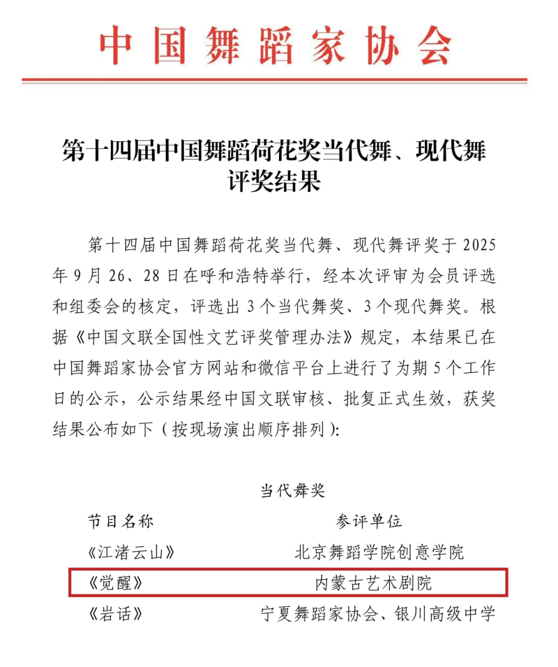 12月20日,第十四届中国舞蹈荷花奖当代舞、现代舞评奖结果公布,内蒙古艺术剧院选送的作品《觉醒》成功斩获当代舞奖,这是内蒙古首部获得荷花奖的现当代舞作品,实现了历史性的跨越。