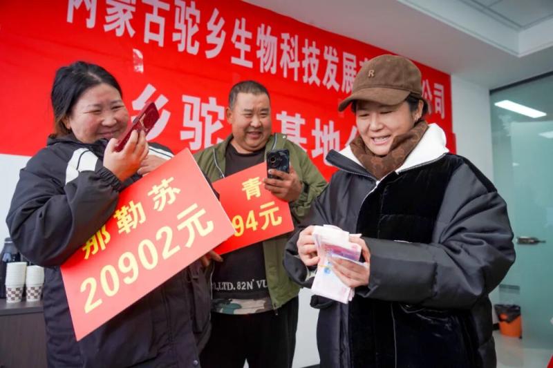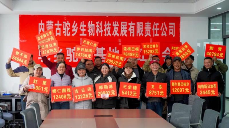 12月19日,额济纳旗温图高勒苏木格日勒图嘎查举办驼乡驼奶基地分红大会,内蒙古驼乡生物科技发展有限责任公司为20户牧民发放37万余元的“产业红利”。