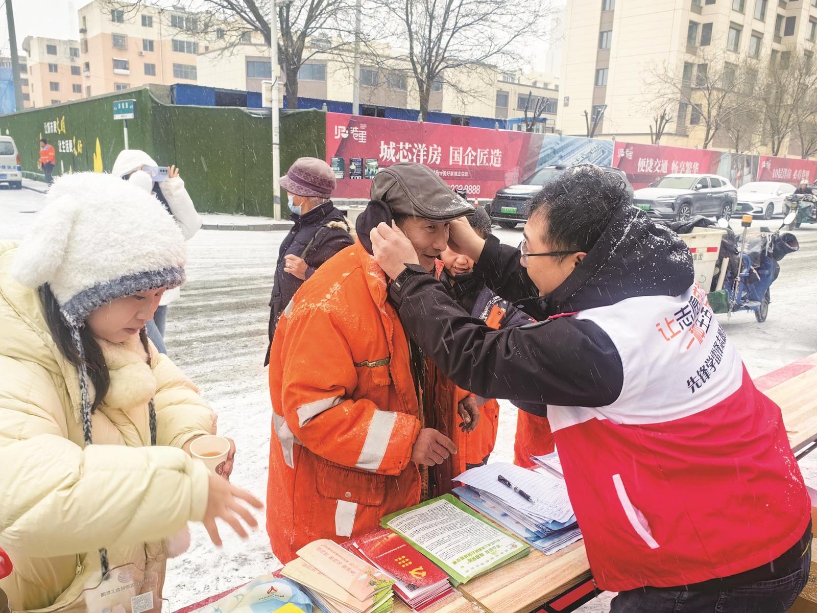 倒茶、发放耳套、手套、暖贴,“注意安全,别滑倒”的叮嘱声,“真暖和,好贴心!”的回应声,让雪中的街头,热闹了起来。