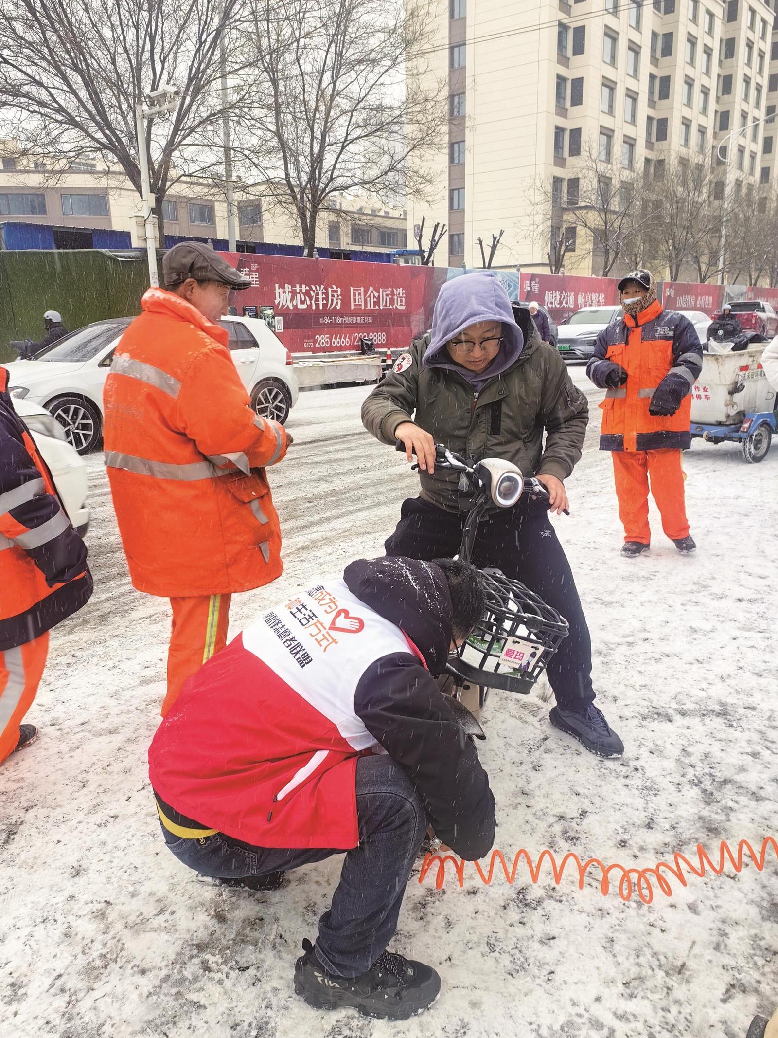 雪越下越大,零下十几摄氏度的严寒中,行人裹紧衣领,步履匆匆。在娜琳步行街北口,流动服务车刚刚停放好,一位疾驰的外卖小哥停下来大喊:“周书记,这天咋还来啦?”