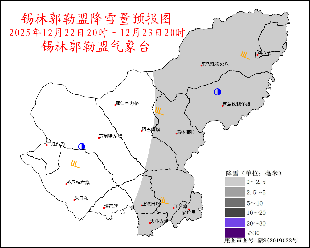 降雪、大风:22日夜间至23日白天,锡林浩特市、乌拉盖管理区、东乌珠穆沁旗、西乌珠穆沁旗、阿巴嘎旗东南部、正镶白旗、太仆寺旗、正蓝旗、多伦县有1毫米及以下小雪;全盟5级(短时6、7级)西北风,伴有吹雪。