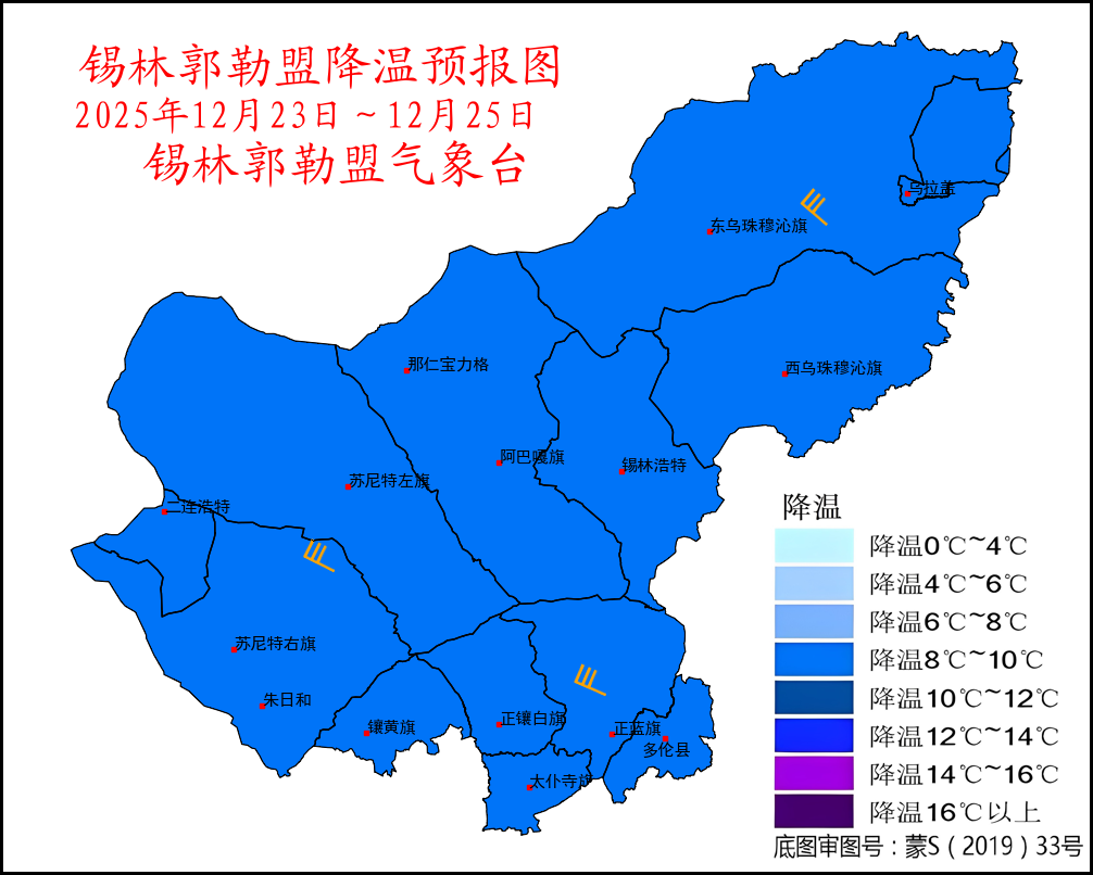 降温:23日至25日,全盟气温下降8℃,局地10℃以上,25日清晨气温降至最低,最低气温-30℃~-20℃,最高气温-19℃~-9℃。