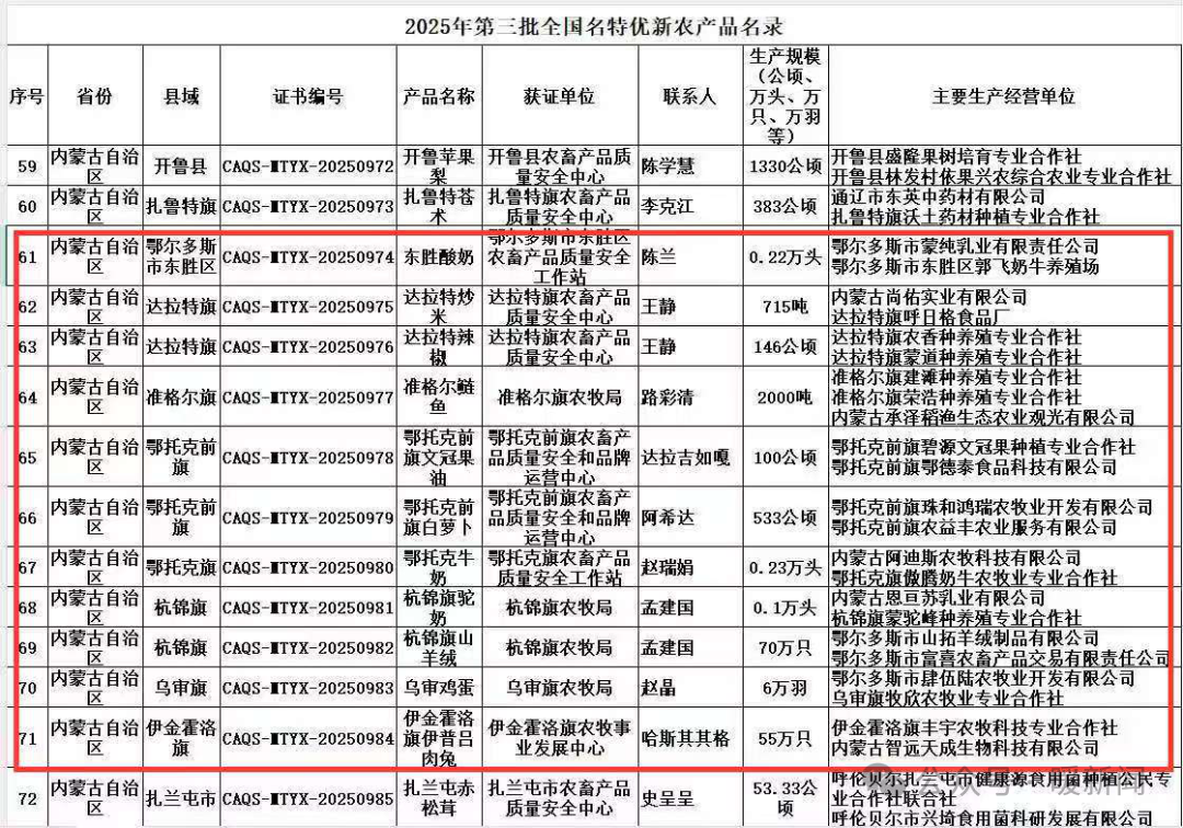 近日,农业农村部农产品质量安全中心公布了2025年第三批全国名特优新农产品名录,鄂尔多斯市共有11个农产品成功入选。截至目前,鄂尔多斯市纳入全国名特优新农产品名录的农产品总数已达到88个,涵盖瓜果、蔬菜、牛羊肉、小杂粮、奶制品和水产品等诸多种类。