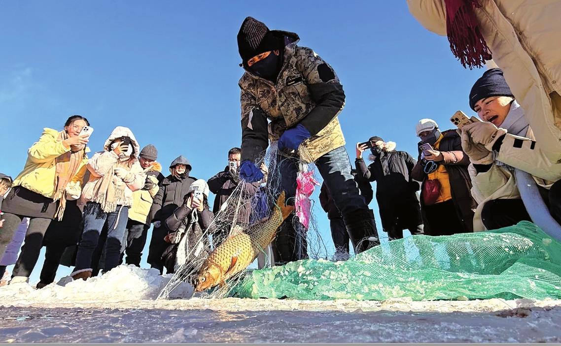 现场不仅可观赏传统捕鱼,还可参与冰钓、品尝湖鲜。图为景区工作人员为来自广州的游客展示传统冬捕。(孙沐野)