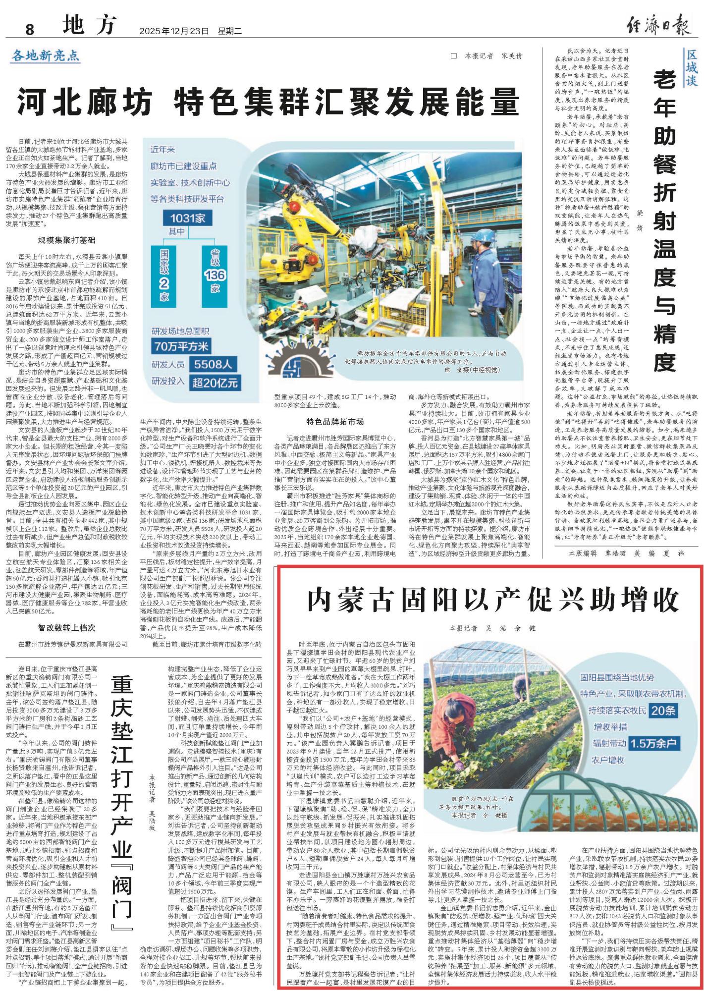 2025年12月23日,《经济日报》第8版刊发题为《内蒙古固阳以产促兴助增收》的文章,报道了内蒙古固阳县发展现代农业产业园和特色食品加工等产业,通过“公司+农户”模式创造就业岗位,落实帮扶政策,带动农户增收,巩固脱贫成果,推进乡村振兴。