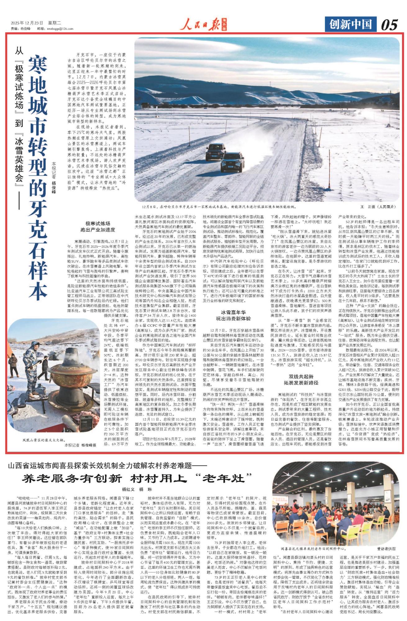 2025年12月23日,《人民日报海外版》第5版刊发题为《从“极寒试炼场”到“冰雪英雄会”——寒地城市转型的牙克石样本》的文章,报道了内蒙古牙克石市迎来一年中最繁忙的时节。随着内蒙古冰雪英雄会2025—2026呼伦贝尔市第七届冰雪日暨牙克石凤凰山冰糖葫芦冰雪艺术季正式启动,这座“冰雪之都”正以独特的“专业测试+大众体验”模式,让冰天雪地的“冷资源”持续释放“热效应”。