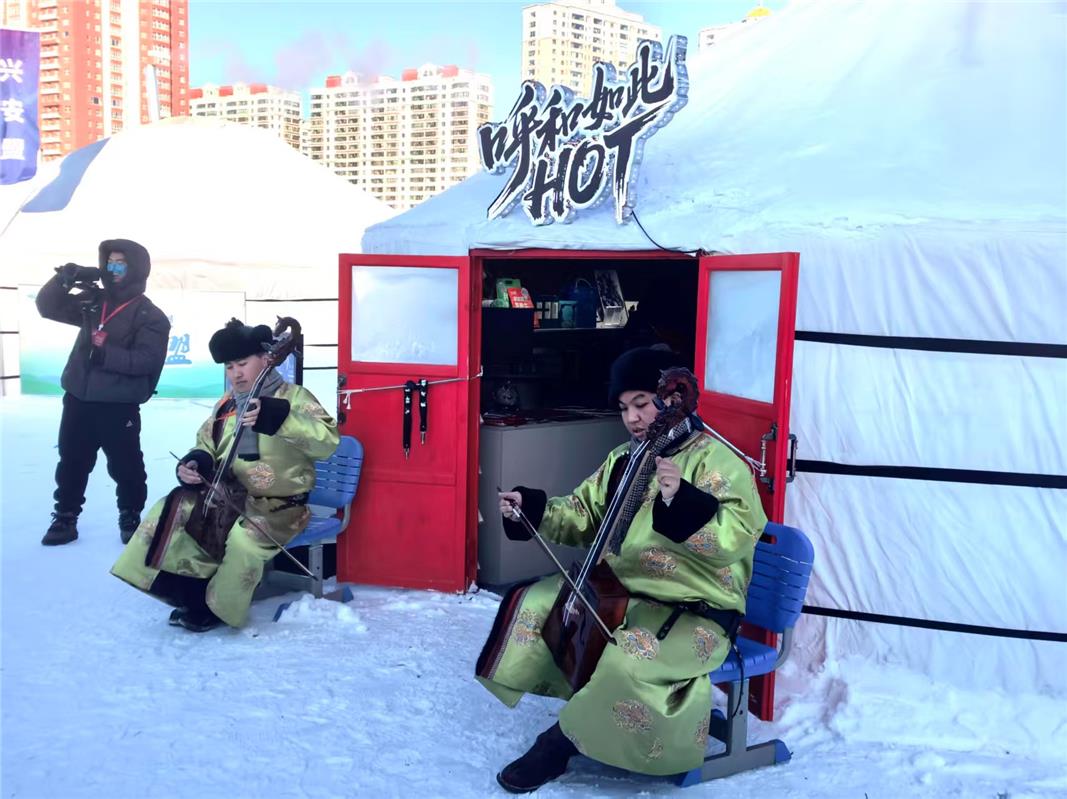 12月21日至23日,在位于呼伦贝尔市海拉尔区的第二十一届内蒙古自治区冰雪那达慕现场,一座挂有“呼和如此HOT”门牌的蒙古包人气十分火爆。