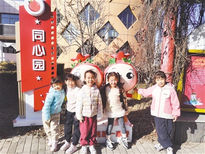 土默特右旗幼儿园的孩子与同心园内的“石榴娃”合影。
