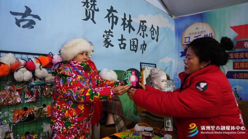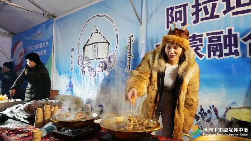 友谊超市、罕乌拉蒙式火锅、满洲利亚、庆客隆超市等本地商家的入驻,让这场大集多了几分亲切的烟火气。摊主们的吆喝声、游客的谈笑声、食物的香气交织在一起,在冰天雪地间绘就了一幅热闹非凡的冬日生活画卷。