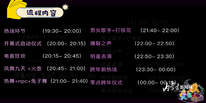 22:50~00:00,明星表演及跨年前热场,歌手、舞者、NPC上场共同跨年。