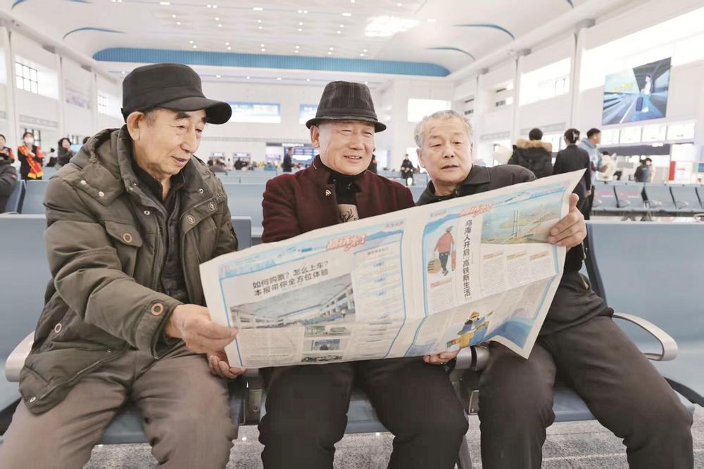 候车旅客阅读《乌海日报·纪念特刊高铁来了》。(王超 摄)
