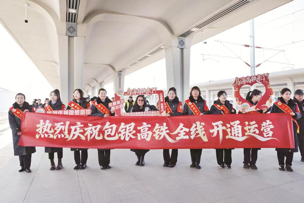 首批到站旅客与乌海站工作人员合影留念。(王超 摄)