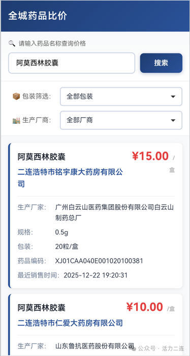 市民登录二连浩特市医保服务平台后,输入药品名称即可清晰查看到同一通用名、同厂牌、同剂型、同规格药品在不同药店的销售价格。还可按照药品价格高低、药店距离远近排序,一键导航直达目标药店,真正做到“购药先比价,省钱又省心”。