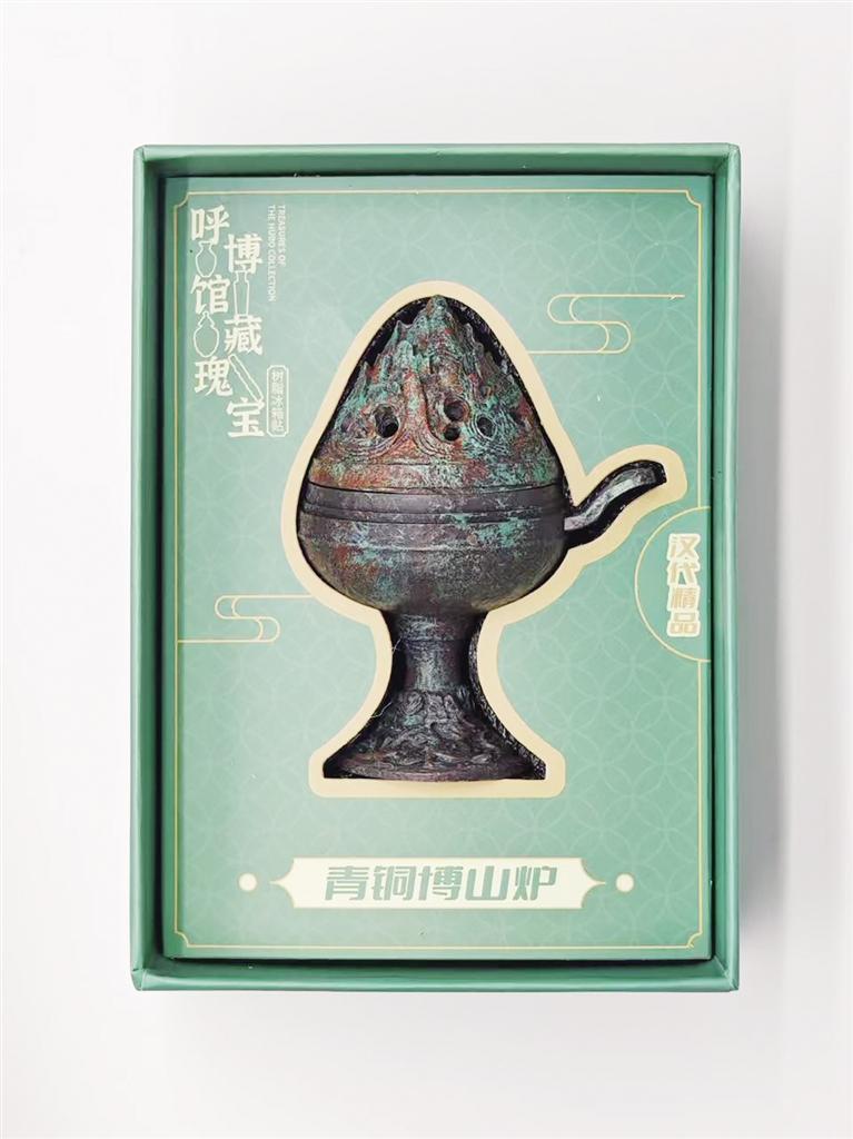 走进呼和浩特市博物馆的文创空间,汉代青铜博山炉发光冰箱贴绝对是“C位担当”。巴掌大的物件里藏着巧思:器身仿豆形圆润饱满,炉盖复刻博山的层峦叠嶂,镂空间还能透出暖光,点亮后宛如山间云雾流转,配上随赠的檀香丸,摆在桌面是雅致香薰,放入车内是天然扩香,古韵与实用结合得恰到好处。