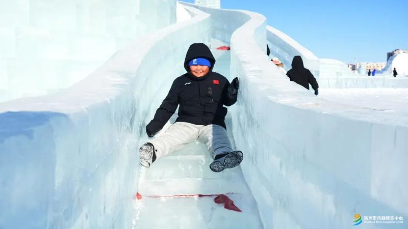 刚刚和朋友一起玩过滑梯的王女士笑着说:“这滑梯又长又陡,滑下来的时候特别刺激。今天特意打扮得漂漂亮亮的,就想和朋友来这儿打卡拍照。这里的冰雕到了晚上更好看,我们每年都会来玩,而且离得近,随时都能过来,特别方便。”
