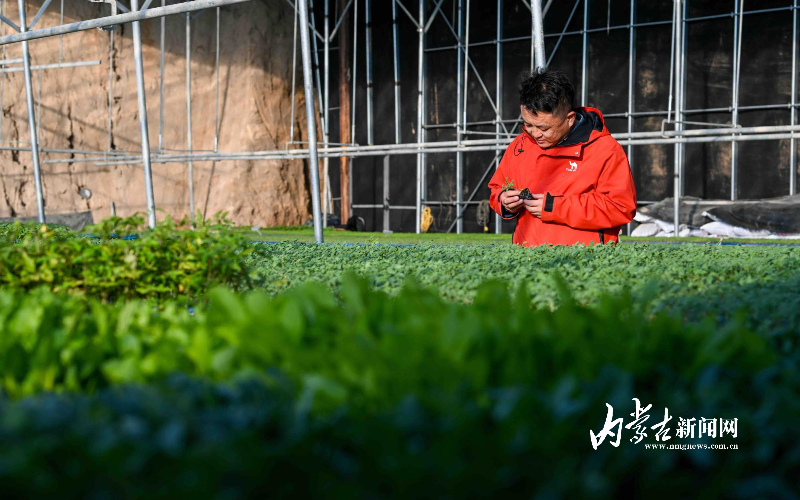 12月25日,在内蒙古蒙苗农业科技有限公司育苗大棚内,工作人员查看蔬菜幼苗长势。该公司育苗基地每年培育西红柿、辣椒、芹菜等多个品种蔬菜幼苗约7000万株,销售至北京、河北、河南、宁夏等省区市。2025年,内蒙古设施农业育苗量近30亿株,产值约14亿元,已累计建成5000万株以上集约化育苗中心15个。摄影/草原云·内蒙古新闻网首席记者 牛天甲
