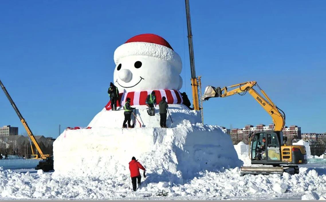 锡林湖上机器轰鸣、冰屑飞舞,一派繁忙景象。230余位工匠日夜奋战,10余台吊车、8台铲车协同作业,在43万平方米的冰雪场地内全力雕琢。取自当地水库的晶莹冰块,在老师傅们的手中经过精密计算,被切割、垒砌;数万吨白雪经过反复压实、塑形,逐渐显现出骏马的英姿、神兽的威严、童话城堡的轮廓。每一处弧度的打磨,每一盏灯光的调试,都凝聚着这群匠人的智慧与汗水。他们对抗着严寒,争分夺秒,只为在元旦佳节,将一座集视觉震撼、文化内涵与极致玩乐于一体的冰雪欢乐汇,完整地展现给游客。
