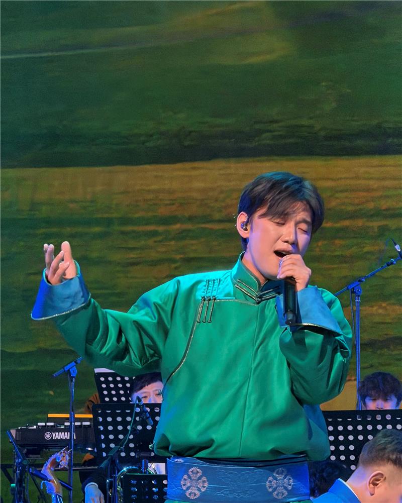 当晚音乐会现场,经典与创新的曲目轮番登场,高潮迭起。马头琴交响乐《茉莉花》突破传统,江南小调在草原音律的演绎下化作辽阔长歌,婉转与苍劲的碰撞赢得满堂喝彩;马头琴与京胡演奏的《夜深沉》,一弦一韵皆藏乾坤,用经典艺术演绎新潮韵味。特邀嘉宾乌兰图雅与傲日其愣的登场更将气氛推向顶点。乌兰图雅以嘹亮声线演绎亲自填词的《小草》,傲日其愣深情唱响出圈曲目《父亲的草原母亲的河》,质朴旋律裹挟着对故乡的眷恋,与马头琴的悠远琴音交织,不少观众热泪盈眶。