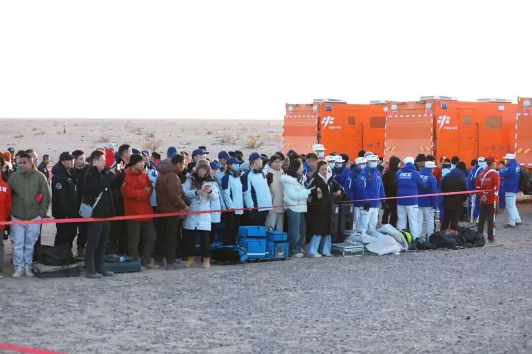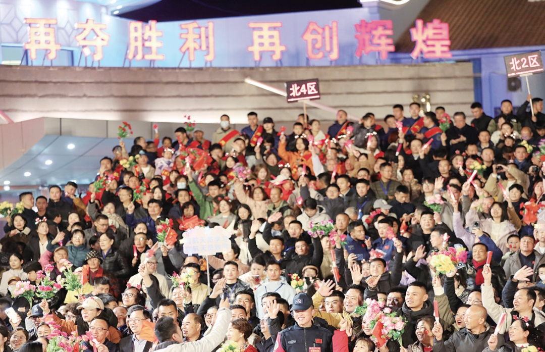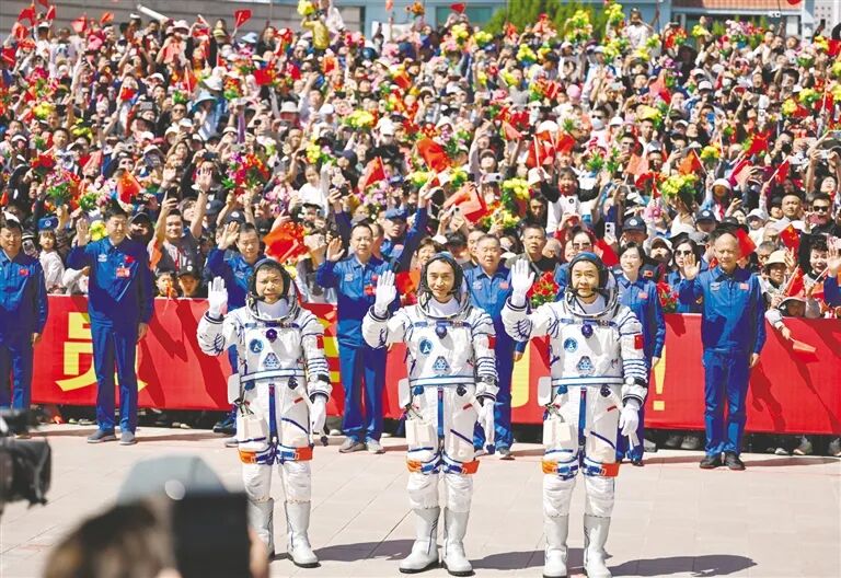 现场群众共同迎接神舟二十号乘组航天员凯旋。