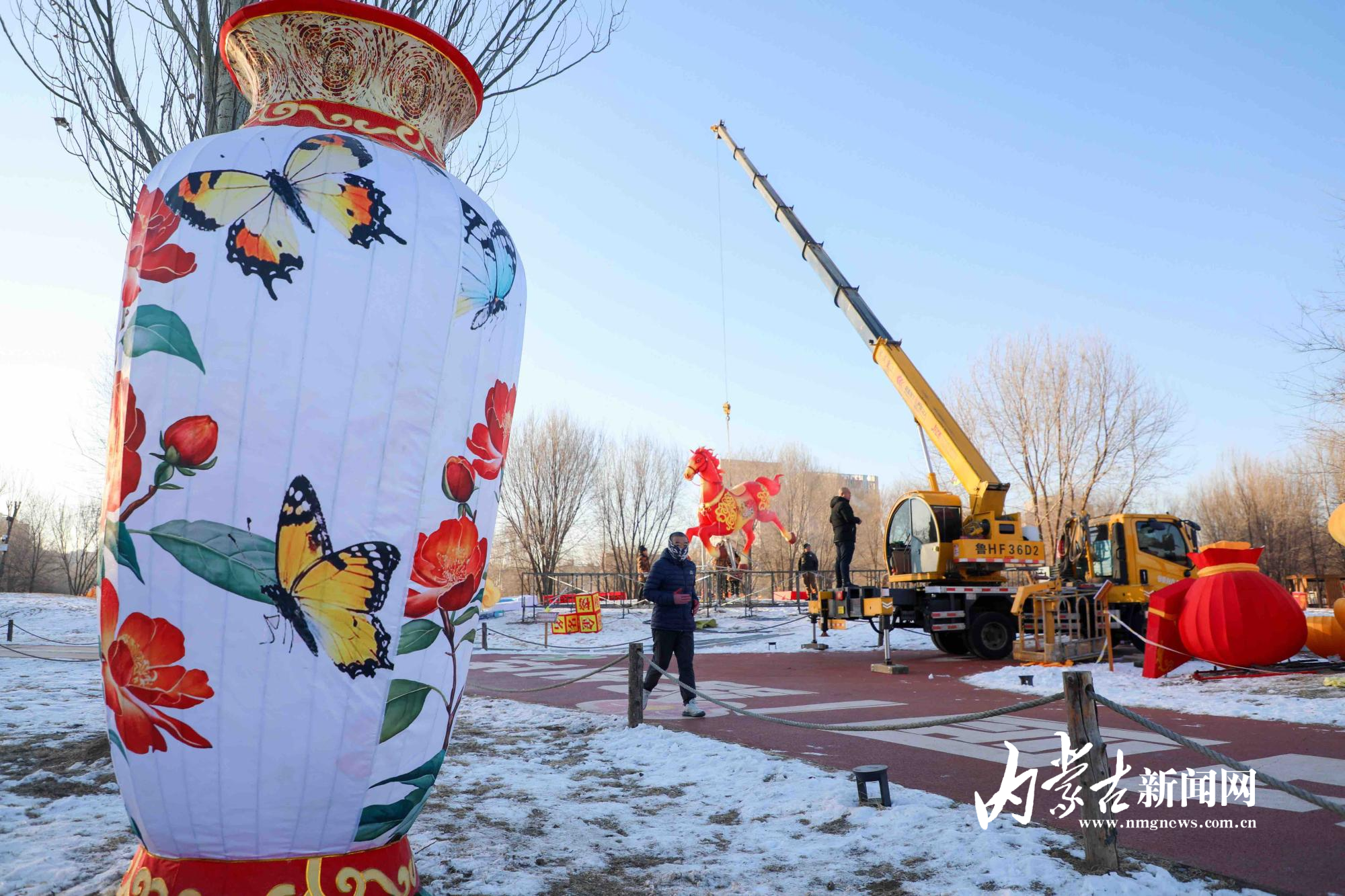12月29日,在呼和浩特小草公园,工作人员正在安装以“马”为主题的花灯,为即将到来的2026年新年灯会做最后准备。随着2026年的临近,公园里的新年氛围日渐浓厚,各类灯组紧张布置中,届时将为市民和游客呈现兼具传统文化元素与喜庆氛围的视觉盛宴。摄影/草原云·内蒙古新闻网首席记者 牛天甲