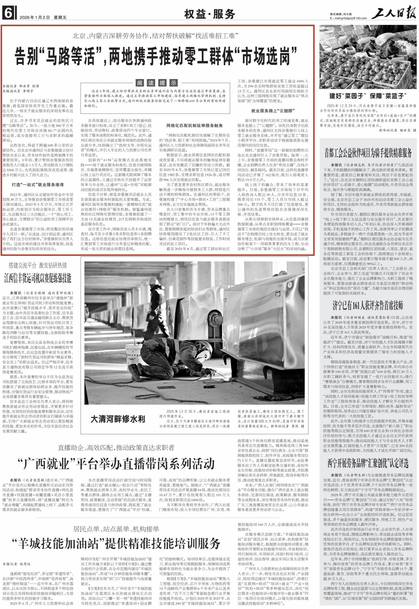 2026年1月2日,《工人日报》第6版刊发了《告别“马路等活”,两地携手推动零工群体“市场选岗”》的文章,报道了内蒙古自治区通辽市奈曼旗与北京市通州区结对帮扶关系在劳务协作方面深入推进。过去5年间,通过主导推动零工市场建设、指导建立网格化管理机制、支持引入线上零工系统等方式,通州的就业服务经验完成了一场跨越600多公里的有效传递和转化,成为京蒙协作框架下一项硕果累累的民生工程。