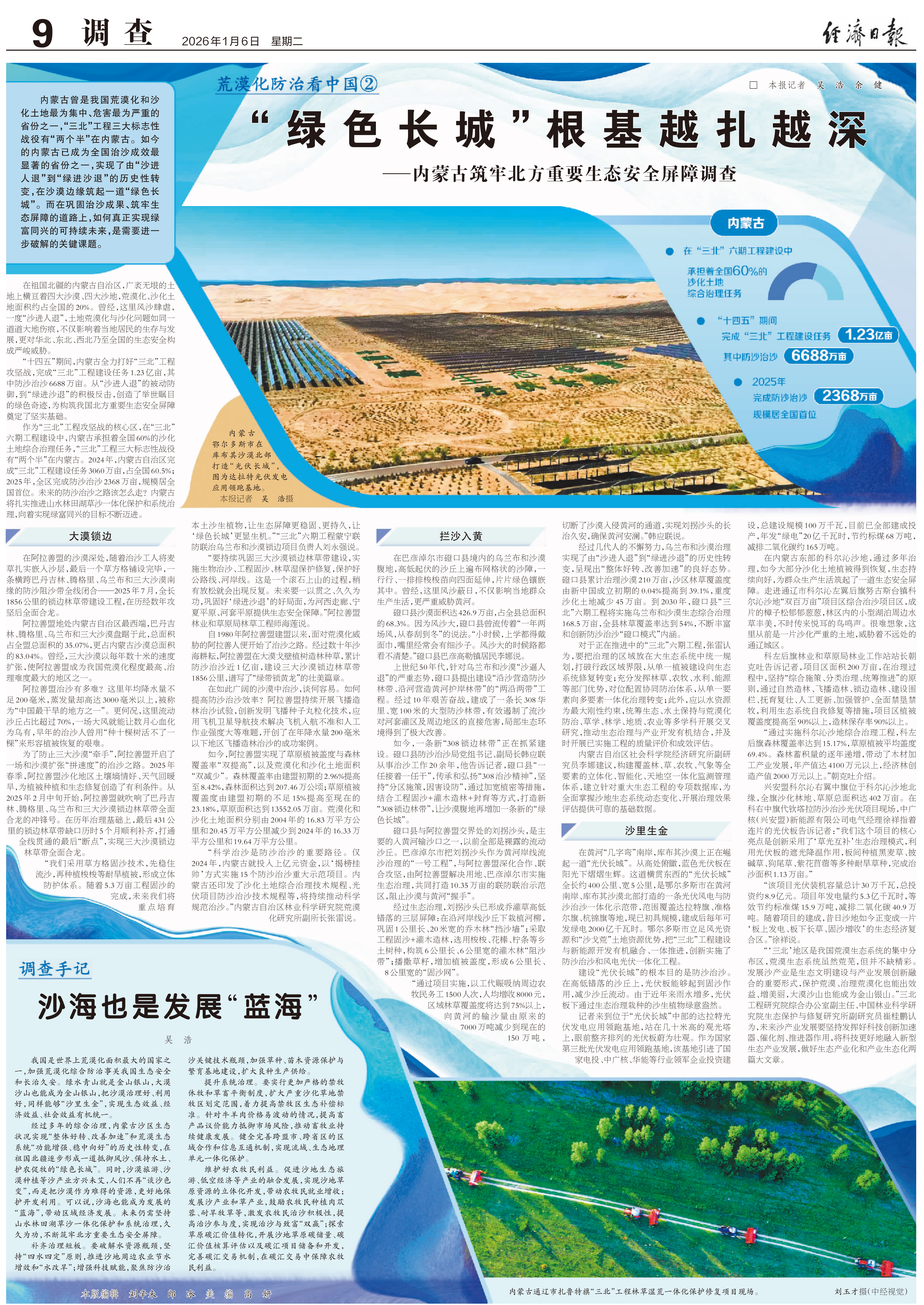 2026年1月6日,《经济日报》9版刊发题为《“绿色长城”根基越扎越深——内蒙古筑牢北方重要生态安全屏障调查》的文章,报道了内蒙古曾是我国荒漠化和沙化土地最为集中、危害最为严重的省份之一,“三北”工程三大标志性战役有“两个半”在内蒙古。如今的内蒙古已成为全国治沙成效最显著的省份之一,实现了由“沙进人退”到“绿进沙退”的历史性转变,在沙漠边缘筑起一道“绿色长城”。
