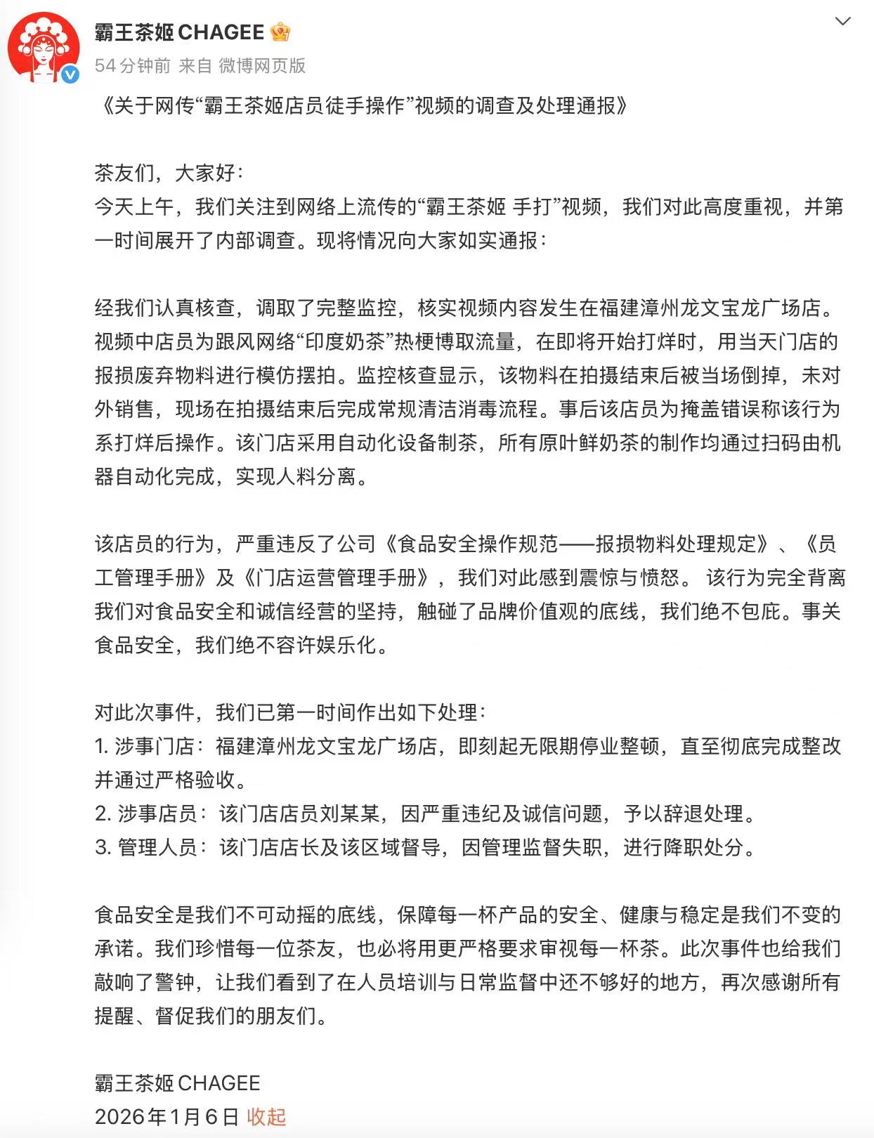 上证报中国证券网讯(记者 伊妹儿)1月6日,“霸王茶姬CHAGEE”发布微博《关于网传“霸王茶姬店员徒手操作”视频的调查及处理通报》,称视频中店员为跟风网络“印度奶茶”热梗博取流量,在即将开始打烊时,用当天门店的报损废弃物料进行模仿摆拍。目前已辞退涉事员工,涉事门店即刻起无限期停业整顿。此前,网传视频显示,一霸王茶姬店员未佩戴手套,徒手捏挤柠檬片或橙片后,直接用手在奶茶杯内搅拌饮品。