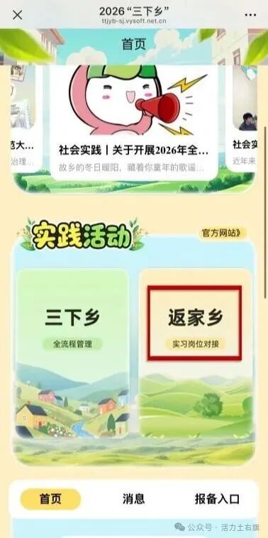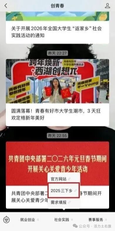 关注“创青春”公众号,选择“社会实践”—“2025三下乡”—“返家乡”栏目。首次登录用户需按提示注册账号并返回登录,已注册的学生或有高校第二课堂成绩单系统账号的学生可直接登录。登录成功后点击项目列表,浏览单位发布的项目信息,浏览项目信息详情,选择项目报名。