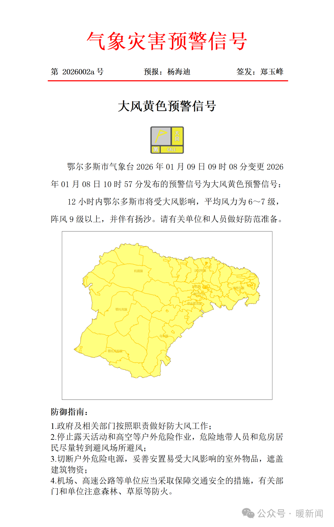 今天(1月9日)9:08,鄂尔多斯市气象台发布大风黄色预警信号:12小时内鄂尔多斯市将受大风影响,平均风力为6~7级,阵风9级以上,并伴有扬沙。