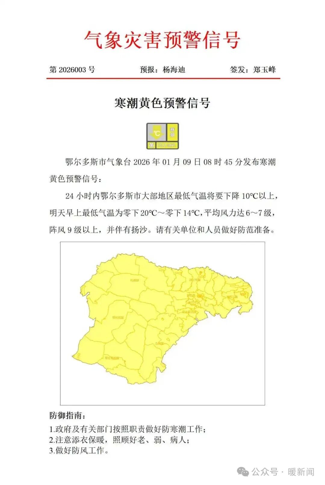 今天(1月9日)8:45,鄂尔多斯市气象台发布寒潮黄色预警信号:24小时内鄂尔多斯市大部地区最低气温将要下降10℃以上,明天(1月10日)早上最低气温为零下20℃~零下14℃,平均风力达6~7级,阵风9级以上,并伴有扬沙。