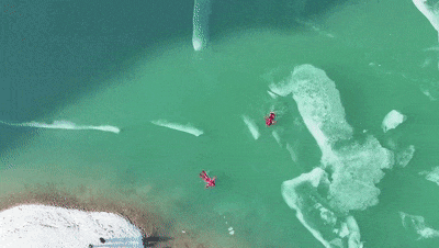 活脱脱一群可爱的“小龙虾”在冰河里撒欢