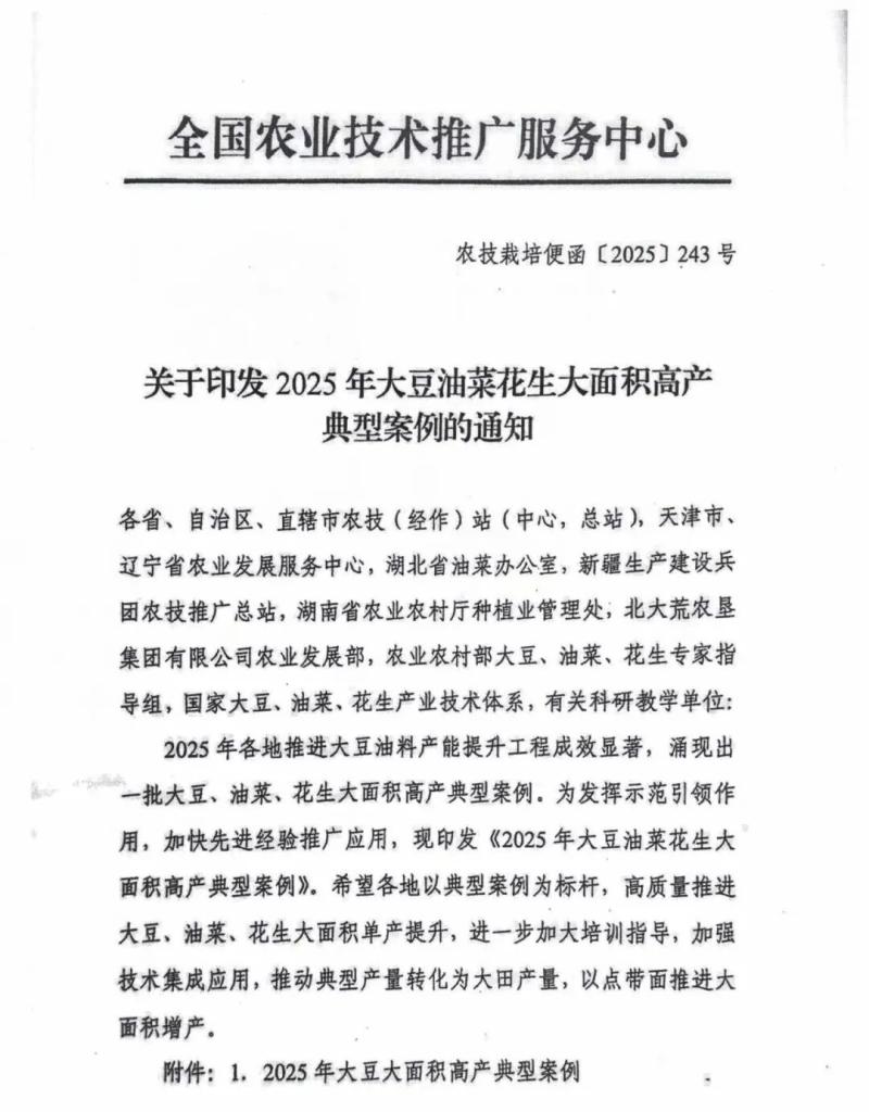 近日,全国农业技术推广服务中心正式印发《2025年大豆油菜花生大面积高产典型案例》,呼伦贝尔市在大豆、油菜区大面积高产中喜获佳绩。其中,大豆清种春播模式内蒙古大兴安岭农垦集团有限公司甘河农牧场分公司第六连(队)亩产达336.13公斤,巴彦农牧场分公司第九连(队)亩产达327.52公斤;巴彦农牧场第五连(队)亩产达318.57公斤;阿荣旗新发乡大有庄村亩产达305.73公斤。春油菜呼伦贝尔农垦哈达图农牧场第十一连(队)千亩片亩产达280.34公斤,特泥河农牧场公司第六连(队)千亩片亩产达261.96公斤。