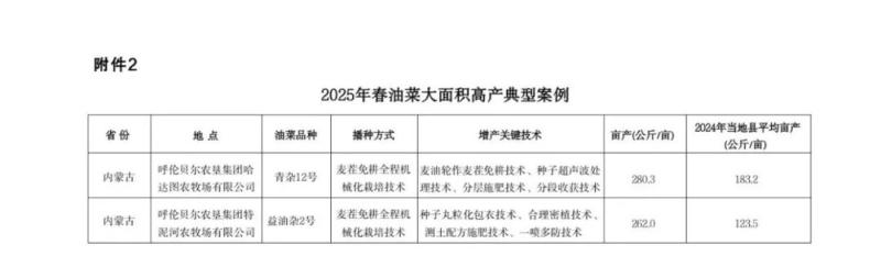 2025年,呼伦贝尔市全力以赴完成主要粮油作物大面积单产提升行动,大豆高产示范区主要采取精选品种,推广测土配方施肥、增施大豆根瘤菌剂、轮作倒茬、种子包衣、精量播种、叶面追肥、病虫草综合防控、一喷多促等关键技术,促进大豆高产高效,辐射带动大面积均衡增产。油菜高产示范区主要选用优质品种,采用麦茬免耕全程机械化栽培技术,推广种子丸粒化包衣、合理密植、测土配方施肥、一喷多防等技术,融合绿色防控等增产关键技术,充分展现了当地在春油菜产能提升方面的扎实成效。