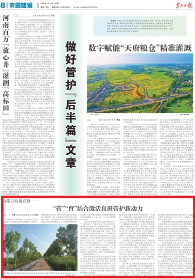 2026年1月12日,《农民日报》第8版刊发了《内蒙古杭锦后——“管”“育”结合激活良田管护新动力》的文章,报道了内蒙古巴彦淖尔市杭锦后旗创新高标准农田管护模式,以德丰村“以育代造”育苗造林模式为示范,将生态管护转化为村集体经济增收、村民就业创收的产业。