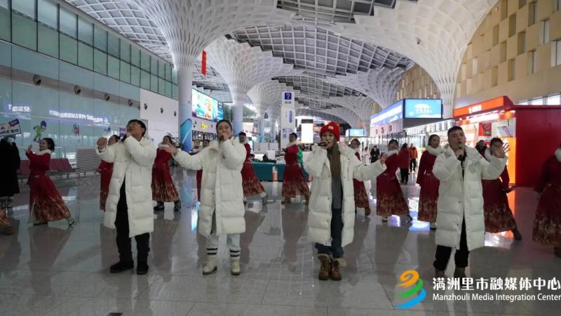 活动的欢乐氛围还延伸到了海拉尔国际机场。《满洲里我的爱恋》《美丽套娃请你来》《冰雪芳华》等节目精彩上演,演员们身着靓丽服饰,在机场大厅载歌载舞,欢快的旋律让行色匆匆的旅客纷纷驻足,拍照留念,沉浸在欢快的氛围中。“我从阿荣旗过来的,这儿的氛围也太热烈了!尤其是那首唱套娃的歌,听完我特别想去套娃景区看看。”游客朱久玲的话语道出了这场活动的独特吸引力。