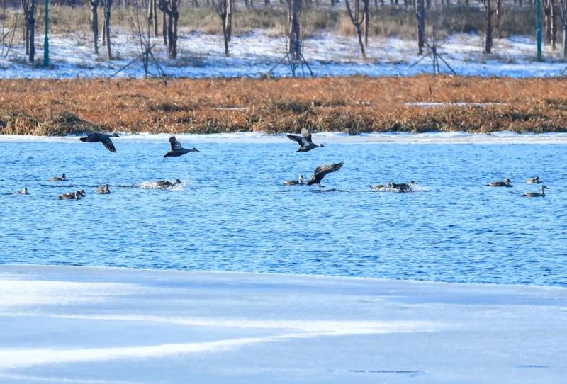这片湿地能在三九寒天中保持生机,得益于多重生态设计。开发区相关人员表示,开发区污水处理厂产生的一级A尾水经处理后达到地表Ⅳ类水标准。Ⅳ类水可用于景观补水、城市绿化。因此,这些再生水被注入通辽生态植物园,加上处理后的再生水温度相对较高,大面积开阔水域未结冰,为野鸭提供了充足的觅食水域。
