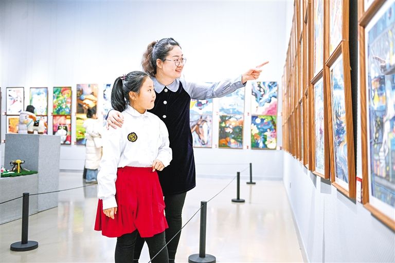 1月14日,观众参观青少年书画作品。当日,“稚笔生花·童墨溢彩”——2026全国青少年美育教育成果之书画作品展在内蒙古美术馆开展。本次展览是“全国青少年美育教育成果”在内蒙古的重要实践与集中呈现,旨在为广大青少年书画爱好者提供一个专业化、高水准的展示交流平台。草原云·内蒙古新闻网记者 王磊 摄