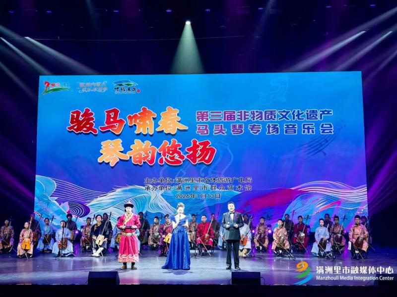 近日,满洲里市乌兰牧骑剧场内琴韵悠扬,掌声阵阵,由满洲里市文体旅游广电局主办、满洲里市群众艺术馆承办的“骏马啸春 琴韵悠扬”第三届非物质文化遗产马头琴专场音乐会在此精彩上演。活动汇聚了从国家级到市级的多位艺术家与马头琴传承者,以琴为媒,奏响草原文化的深厚回响。