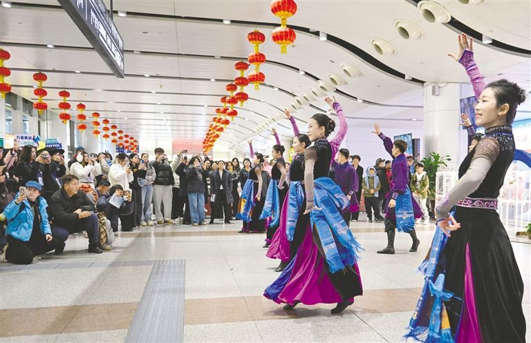 1月16日,乌兰牧骑队员在活动现场表演舞蹈。当日,呼和浩特市文化旅游广电局在呼和浩特白塔国际机场举办“深呼吸”大湾区重点旅行商(头部达人)呼和浩特文旅踩线团欢迎快闪仪式。据了解,“青城链鹏城 文旅创未来”南北协作框架推广以来,通过实地体验与精准对接,实现大湾区客源规模化、常态化输入呼和浩特。草原云·内蒙古新闻网记者 王磊 摄