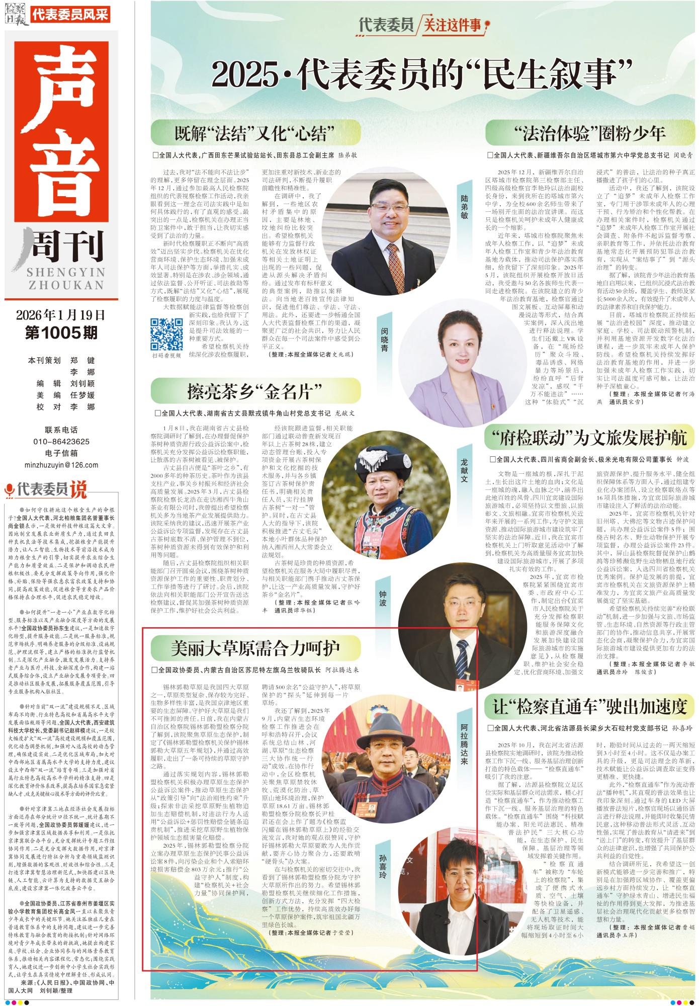 2026年1月19日,《检察日报》5版刊发了《美丽大草原需合力呵护》的文章,报道了内蒙古自治区检察院锡林郭勒盟检察分院聚焦草原生态保护,制定了《锡林郭勒盟检察机关保护锡林郭勒大草原五年规划》,并通过高效履职,走出了一条可持续的草原守护之路。