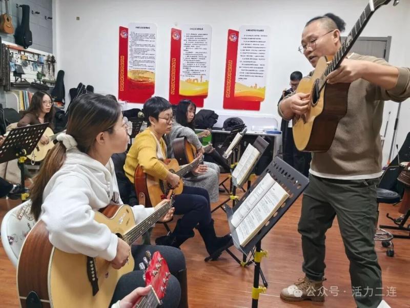 音乐教室里,在老师的指导下,女学员们坐姿挺拔,逐句揣摩旋律,歌声从生疏到和谐,悠扬婉转的和声在空气中流淌,交织成最动人的夜之乐章;吉他课和古筝课上,优美的旋律在琴弦间灵活跃动,时而轻快如溪流潺潺,时而温婉如月光洒落。初学者的生涩与进阶者的娴熟相映成趣,奏响对生活的热忱告白,在韵律中学员们感受传统民乐的典雅韵味。