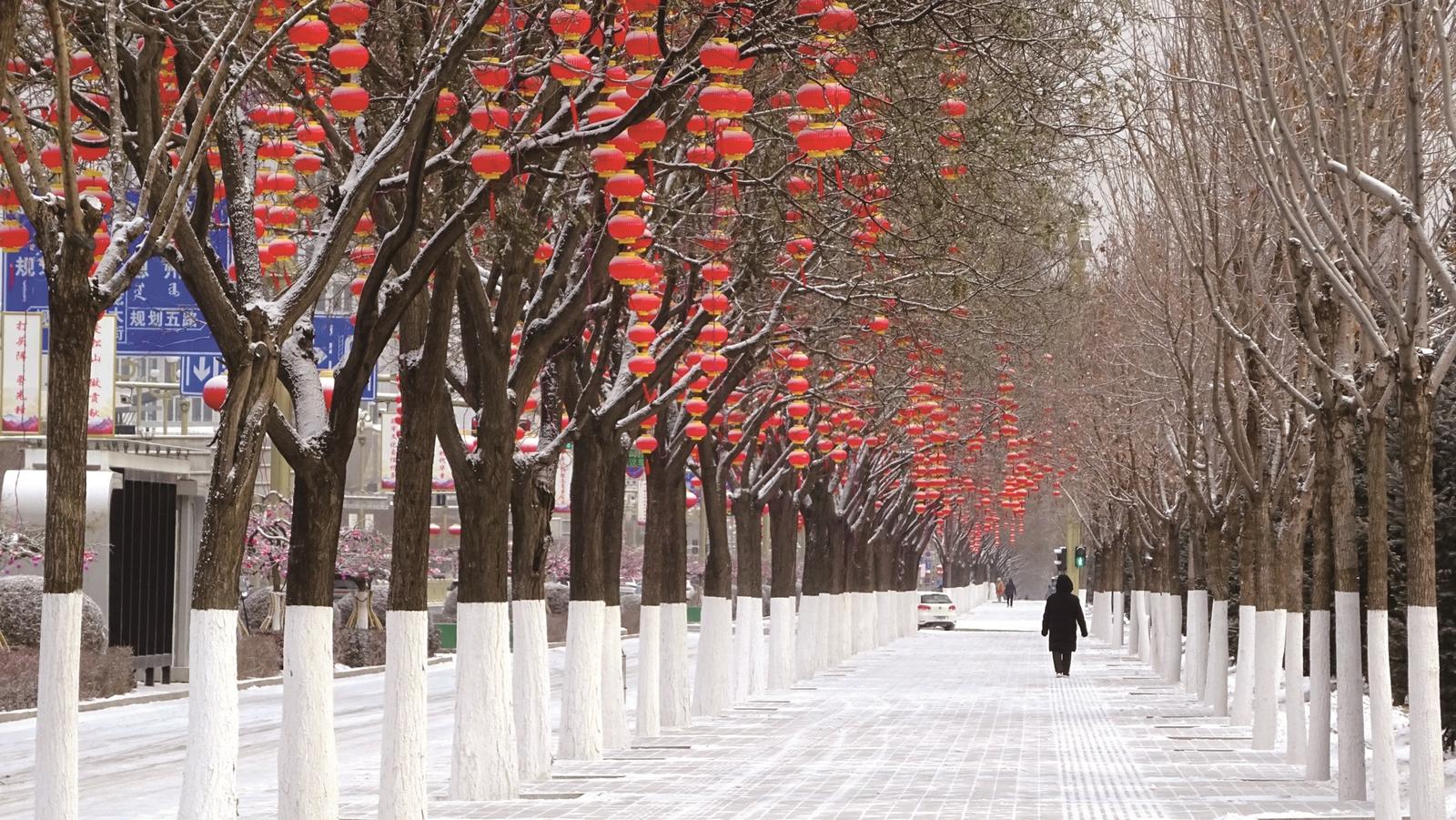 近日,赤峰迎来降雪天气。中心城区一派银装素裹,尤其是皑皑白雪与迎春红灯笼相映成趣,营造出浓浓的喜庆祥和氛围。(周建军)