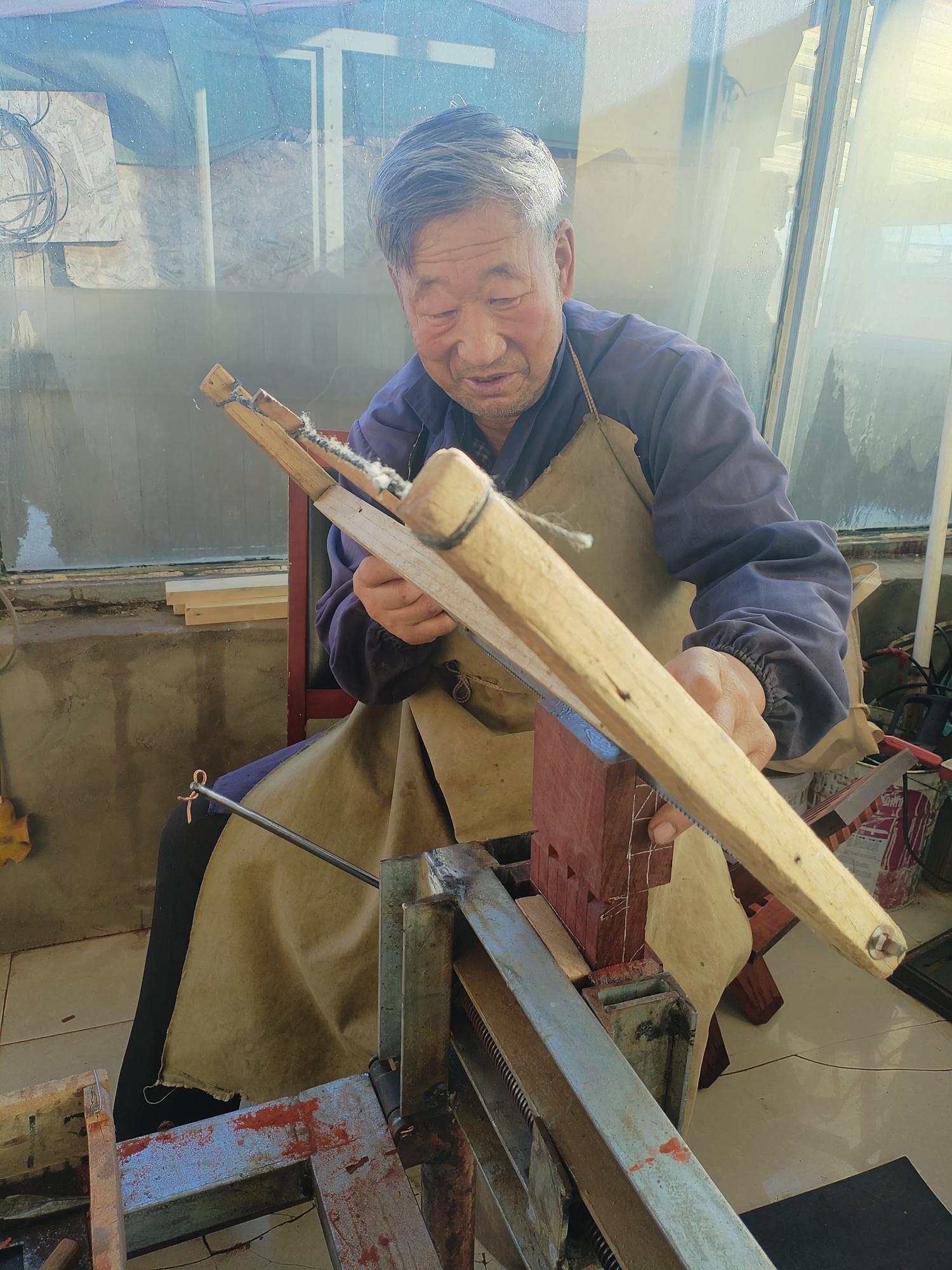 景宏20多岁时正式跟父亲学木匠活。他说:“那时候主要做窗户、门之类的日常家具养家糊口。父亲要求很严格,一个榫头做不好就得重做。”木工学成后,景宏到供销社工作,直到1991年供销社解散,他才回到村里,重新拾起木匠工具。